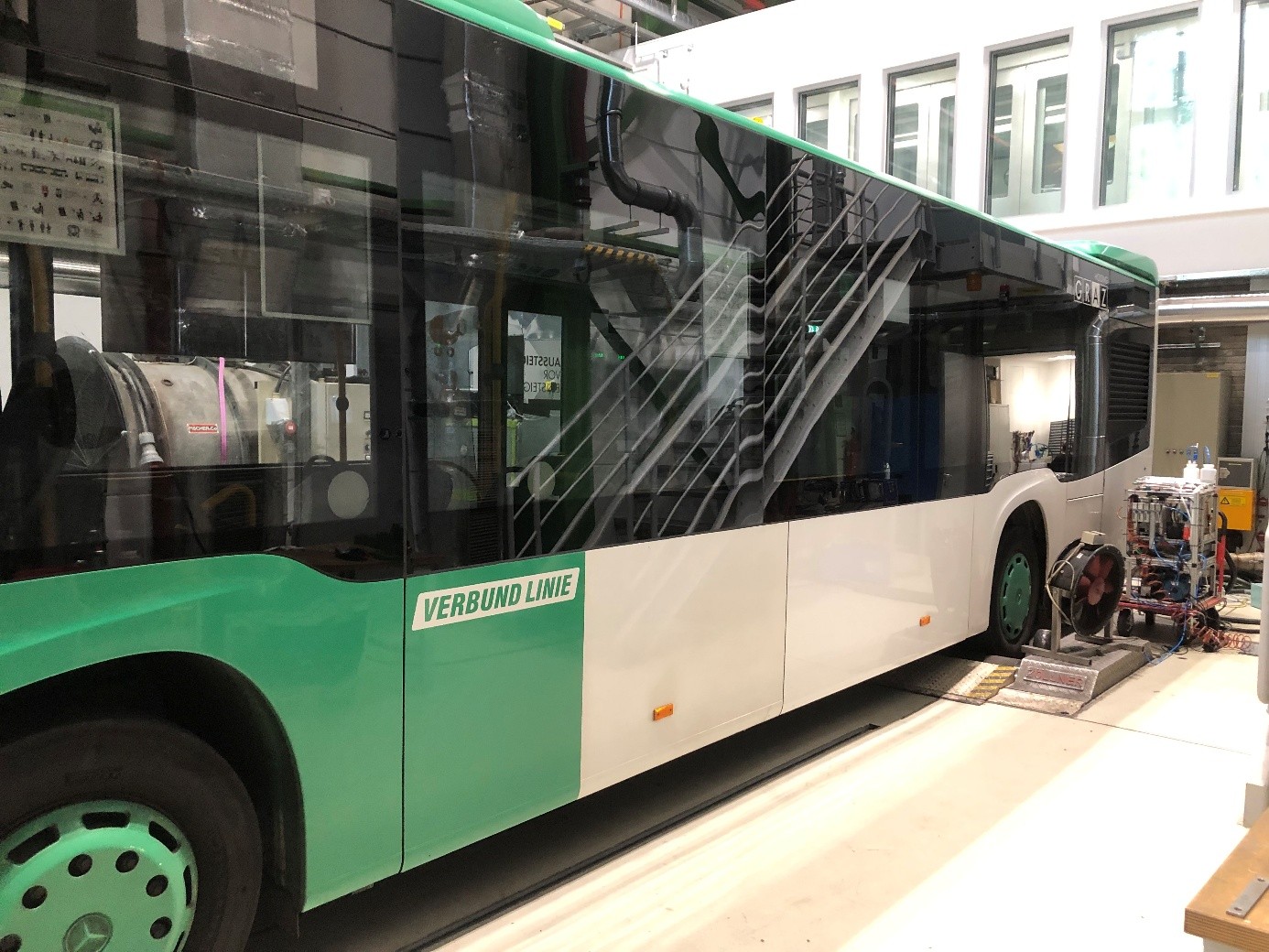 The dynamometer can be run in stationary and transient operation. Both braking and towing operation is possible. Diesel, petrol, natural gas and hydrogen driven vehicles can be tested.